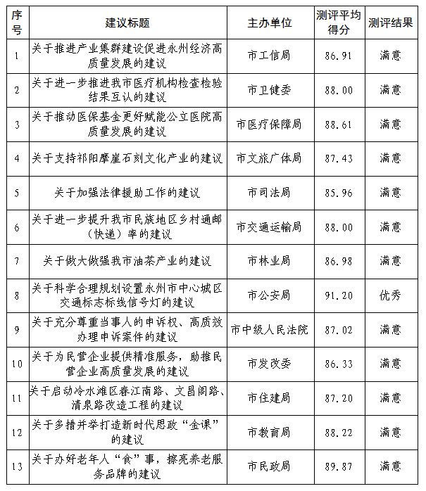 2025年10月23日,市六届人大常委会第二十九次会议听取和审议13个承办单位办理市人大常委会2025年重点督办代表建议情况的报告,并进行了满意度测评。测评结果如下: